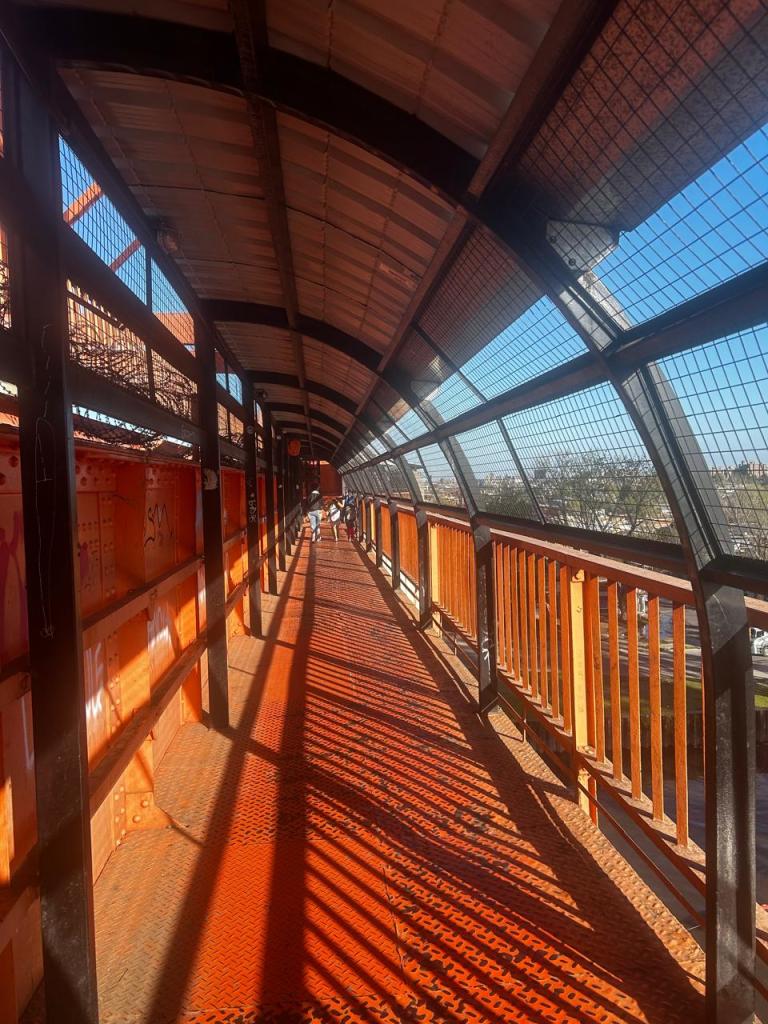 Seguí caminando hacia la ribera, y ahí el cambio es abrupto. El paisaje sigue siendo hermoso, pero el aire se modifica. El Puente Avellaneda apareció, imponente y un poco intimidante, con sus escaleras mecánicas que suben a la pasarela y la sensación, al caminar, de que se venía abajo por el movimiento de la autopista.
